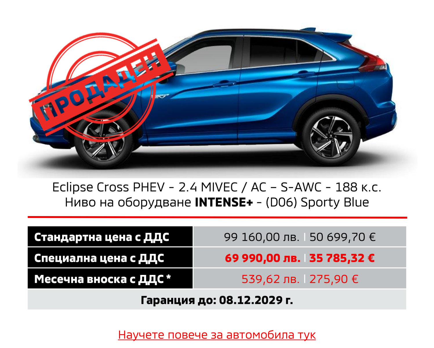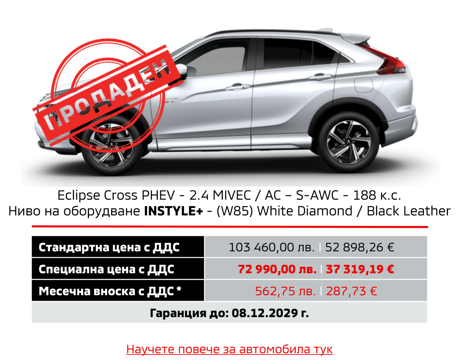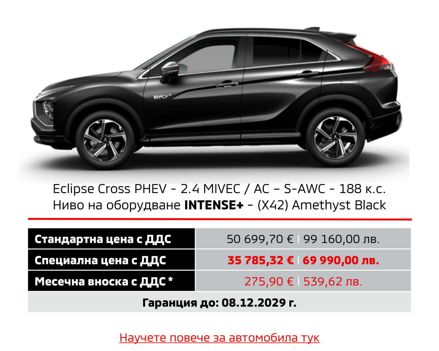 Предлагаме на Вашето внимание Eclipse Cross PHEV с ценово предимство до 15 579,06 €/30 470,00 лв., включващо отстъпки до 14 827,46 €/29 000,00 лв. и подарък цвят металик или специален, и преференциален лихвен процент от Алианц Лизинг България.