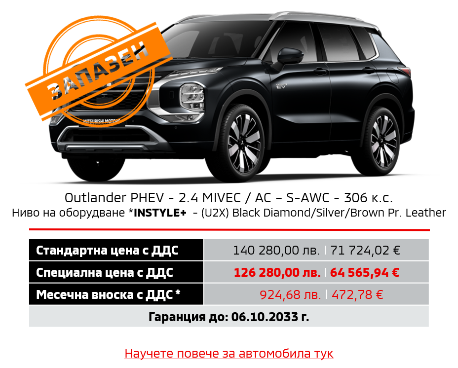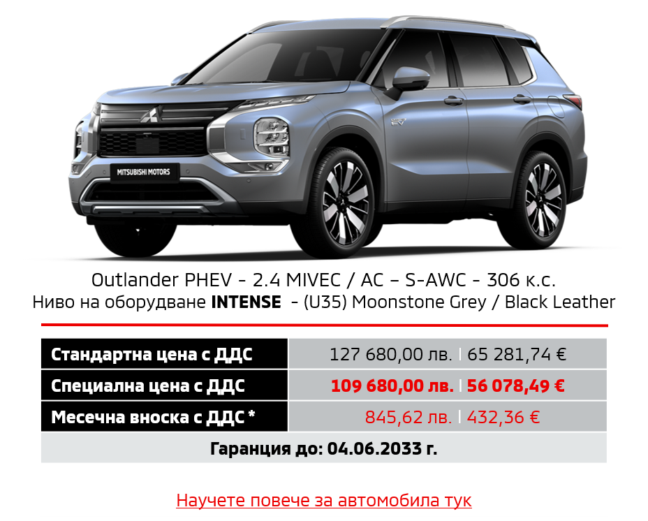 Предлагаме на Вашето внимание новия Outlander PHEV с ценово предимство до 20 000 лв. и преференциален лихвен процент от Алианц Лизинг България.