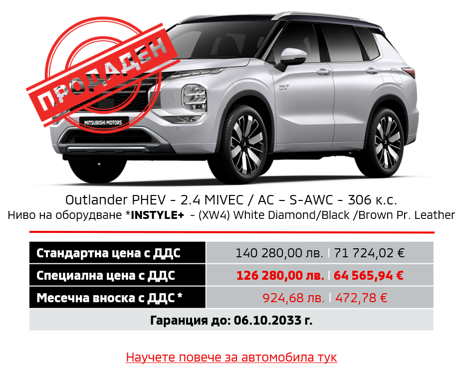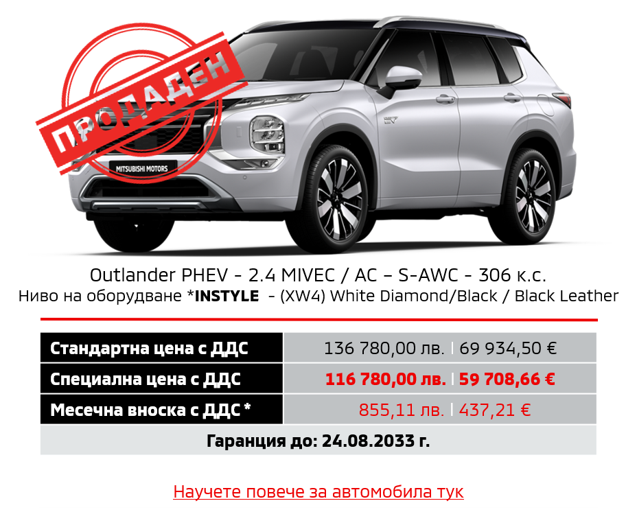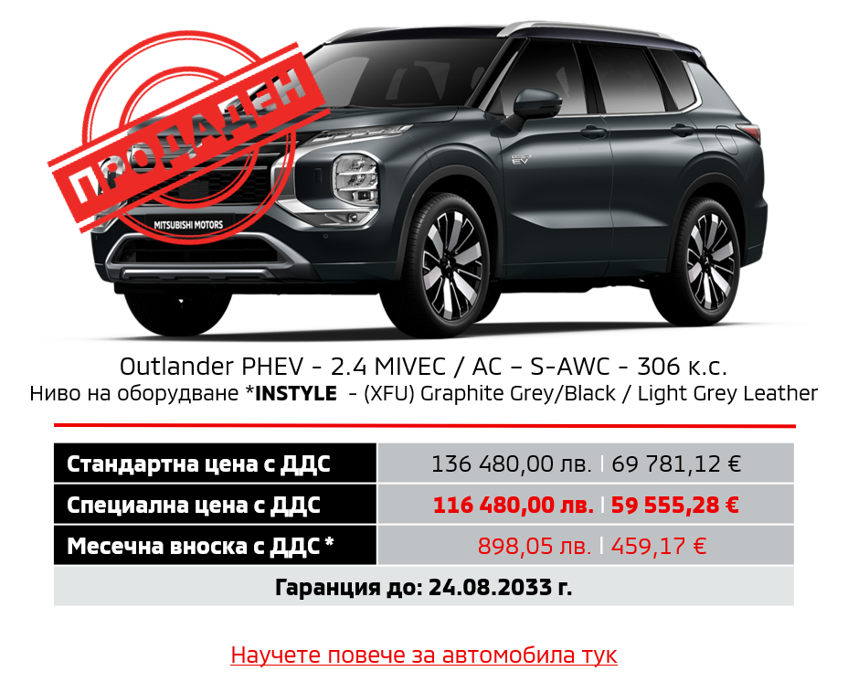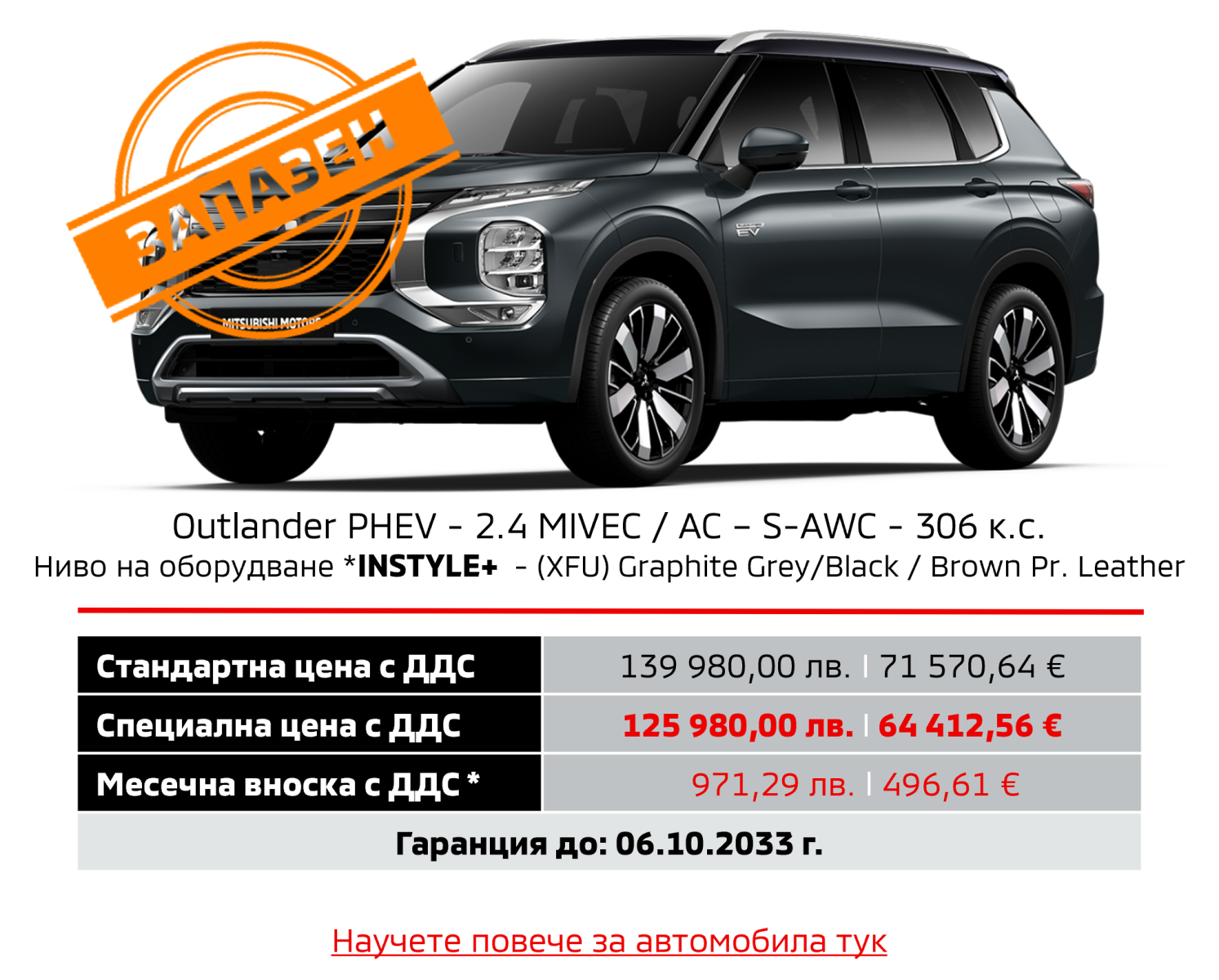 Предлагаме на Вашето внимание новия Outlander PHEV с ценово предимство до 20 000 лв./10 225,84 € и преференциален лихвен процент от Алианц Лизинг България.