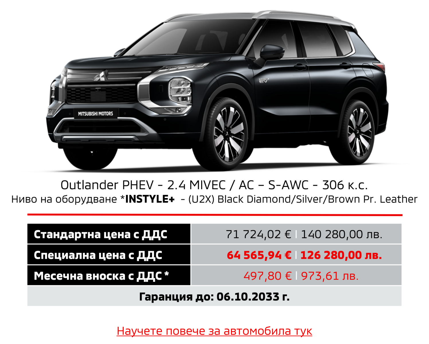Предлагаме на Вашето внимание новия Outlander PHEV с ценово предимство до 10 225,84 €/20 000,00 лв. и преференциален лихвен процент от Алианц Лизинг България.