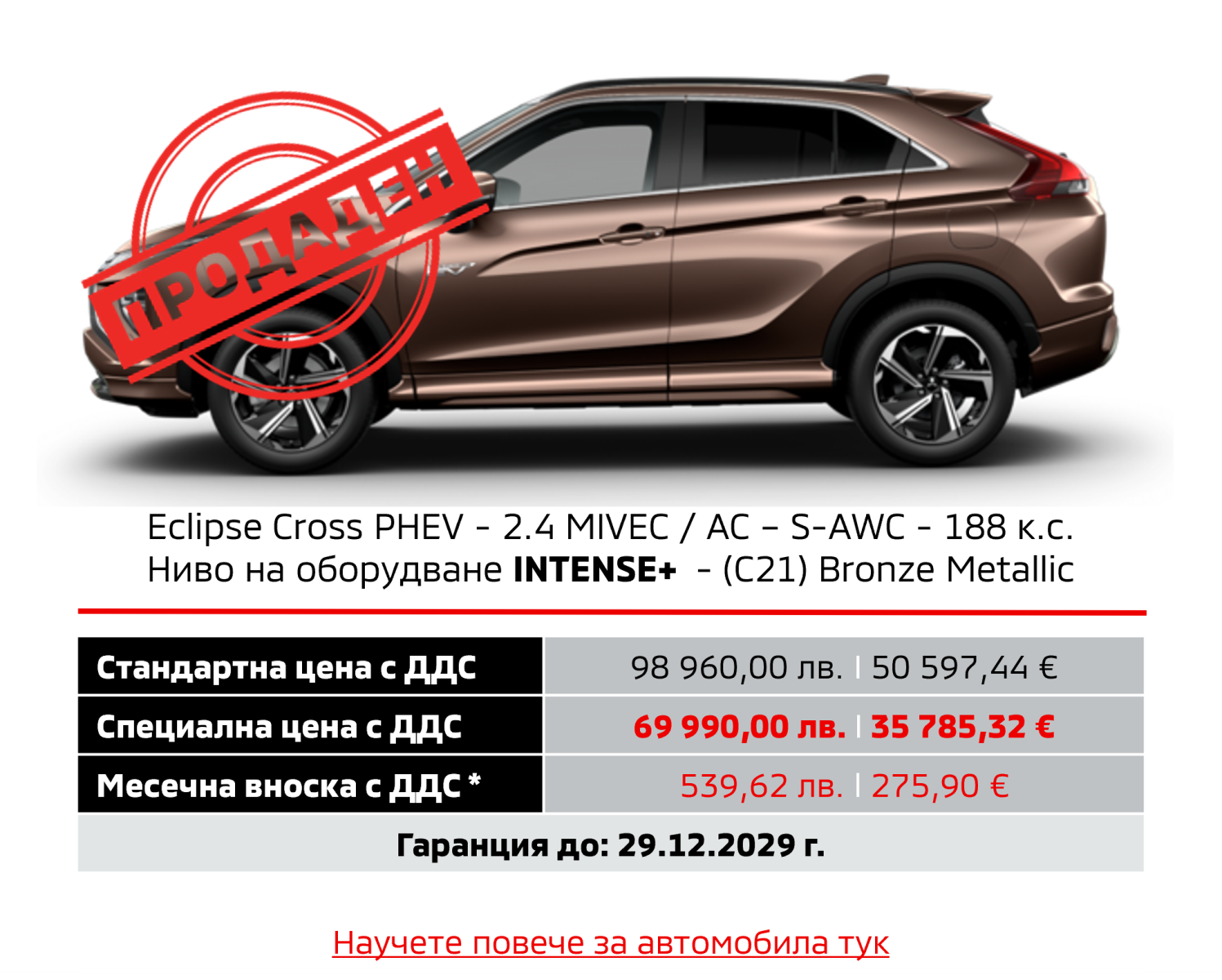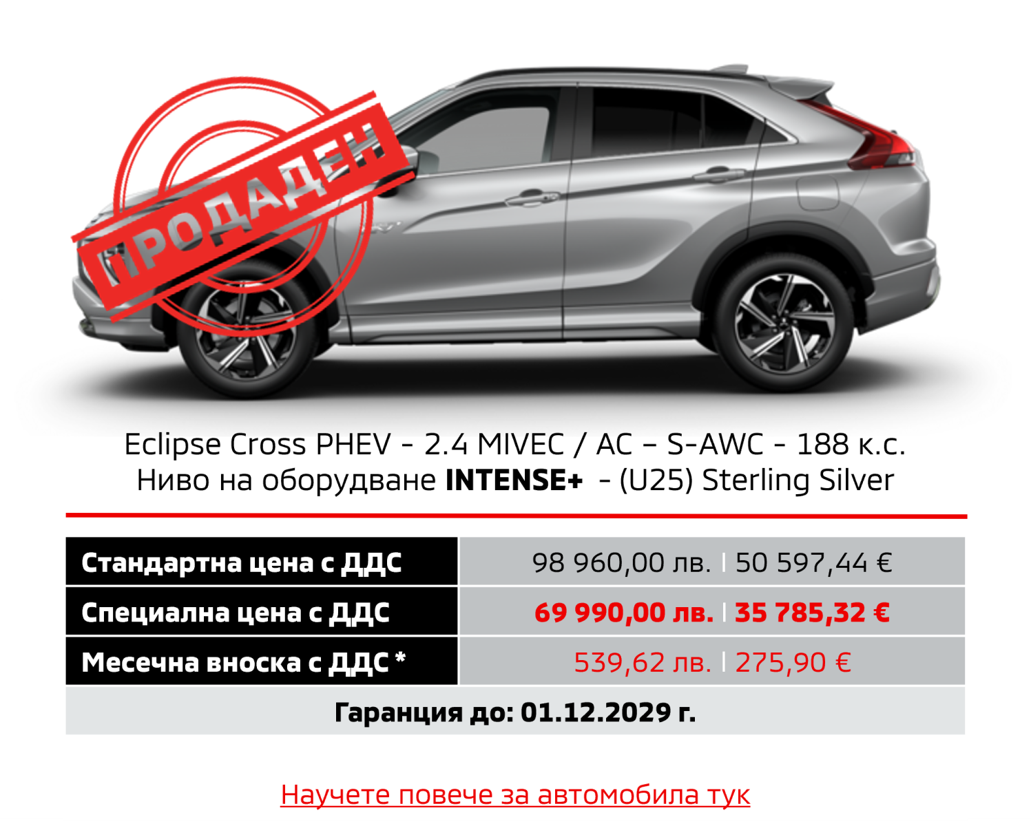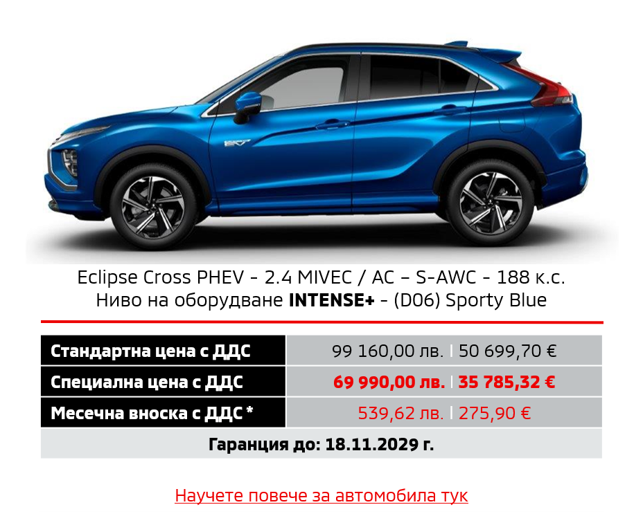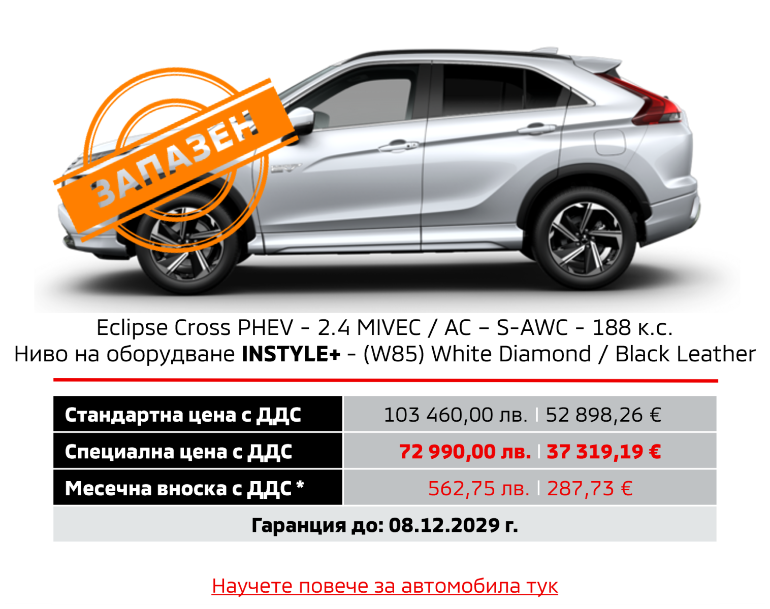 Предлагаме на Вашето внимание Eclipse Cross PHEV с ценово предимство до 30 470 лв./15 579,06 €, включващо отстъпки до 29 000 лв./14 827,46 € и подарък цвят металик или специален, и преференциален лихвен процент от Алианц Лизинг България.