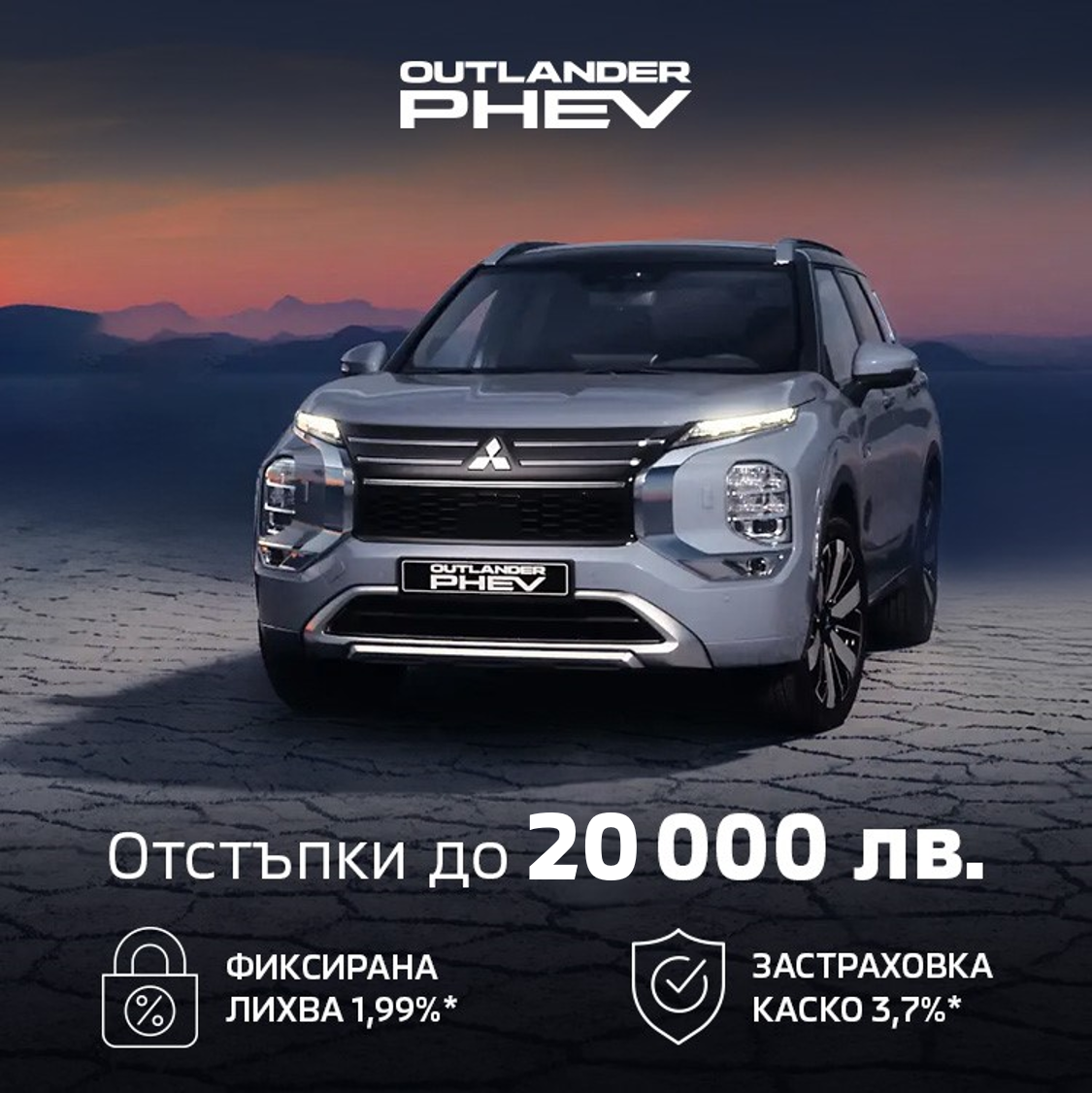 Изберете сега Вашия автомобил от нашата гама, като се възползвате от специалните отстъпки до 26 000 лв. за Eclipse Cross PHEV, до 20 000 лв. за новия Outlander PHEV и до 5 000 лв. за COLT, фиксираната лихва 1,99%* и 3,7%** авто каско с допълнително покритие.