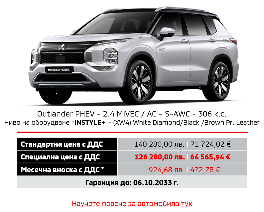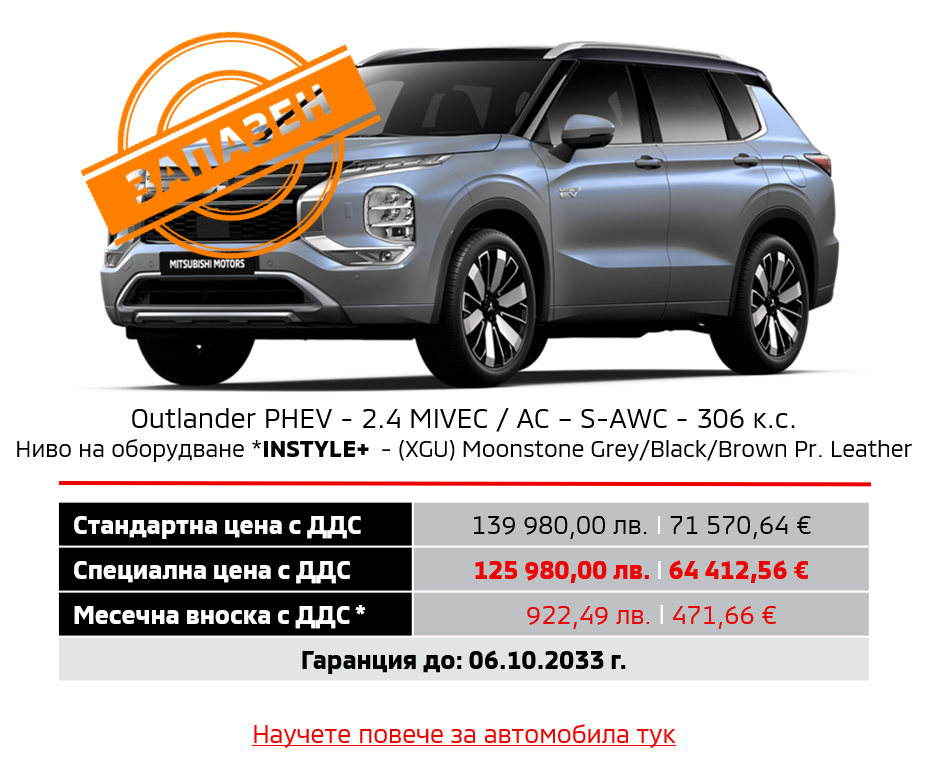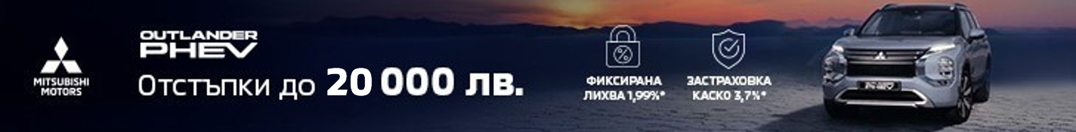 Предлагаме на Вашето внимание новия Outlander PHEV с ценово предимство до 20 000 лв., преференциална фиксирана лихва 1,99%* от Алианц Лизинг България и застраховка КАСКО в размер на 3,7%*, с допълнително покритие.