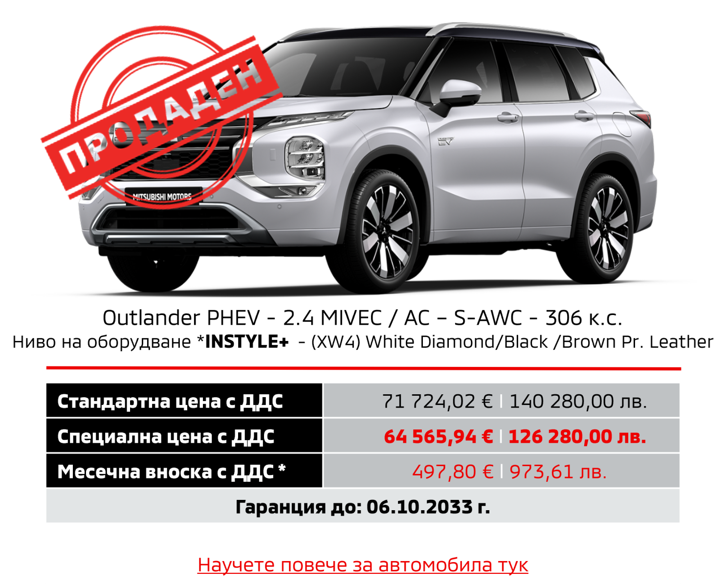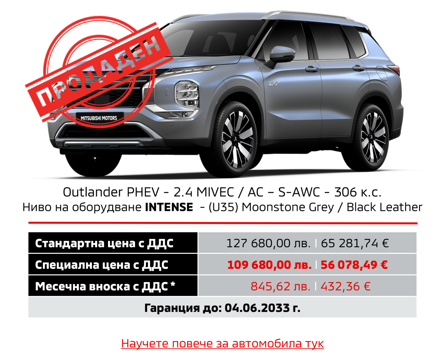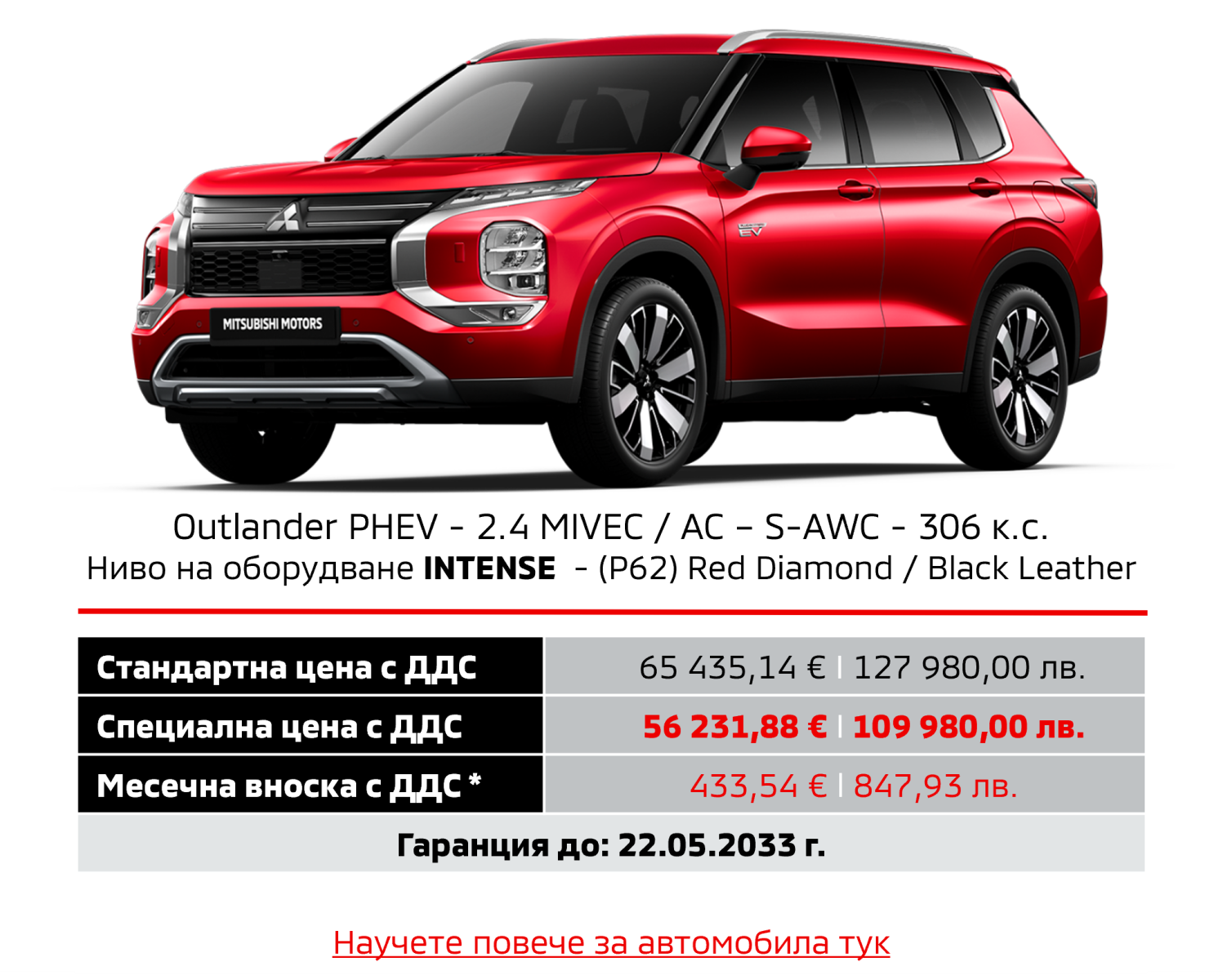 Предлагаме на Вашето внимание новия Outlander PHEV с ценово предимство до 10 225,84 €/20 000,00 лв. и преференциален лихвен процент от Алианц Лизинг България.