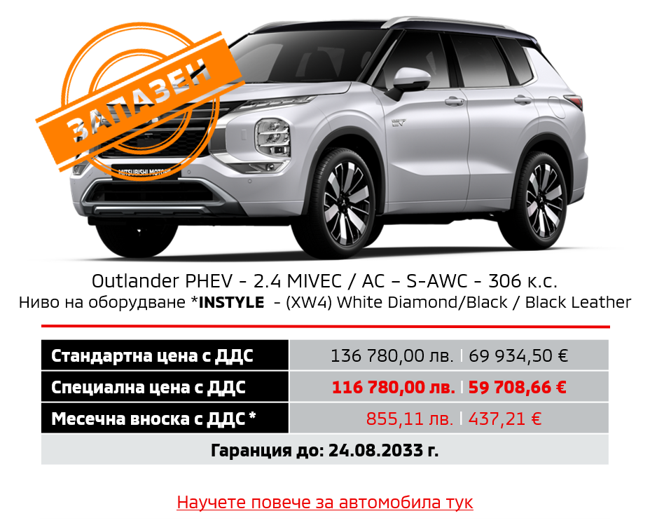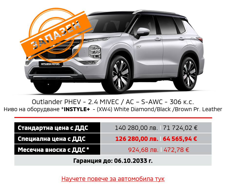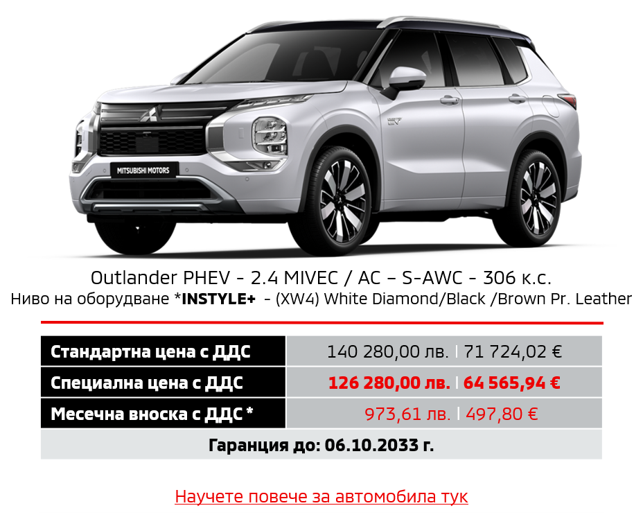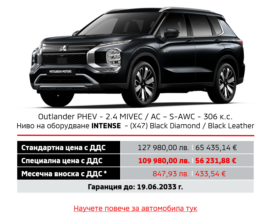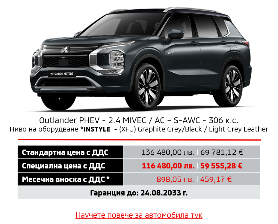 Предлагаме на Вашето внимание новия Outlander PHEV с ценово предимство до 20 000 лв. и преференциален лихвен процент от Алианц Лизинг България.